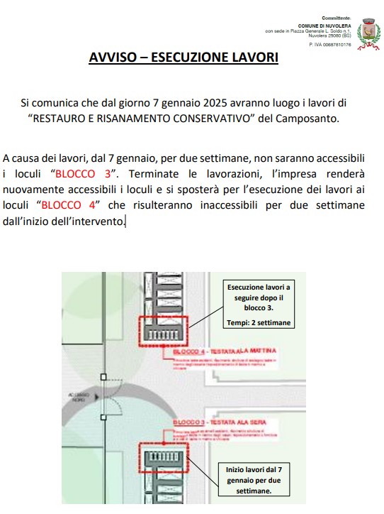 Si comunica che dal giorno 7 gennaio 2025 avranno luogo i lavori di “RESTAURO E RISANAMENTO CONSERVATIVO” del Camposanto. A causa dei lavori, dal 7 gennaio, per due settimane, non saranno accessibili i loculi “BLOCCO 3”.