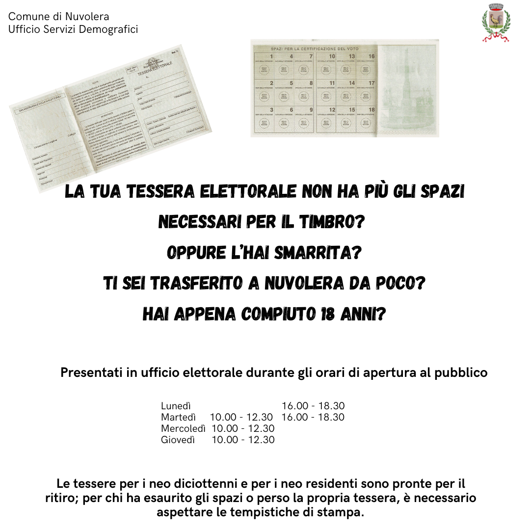 Vieni in Ufficio Elettorale, durante gli orari di apertura al pubblico, per poter ritirare la tua tessera.